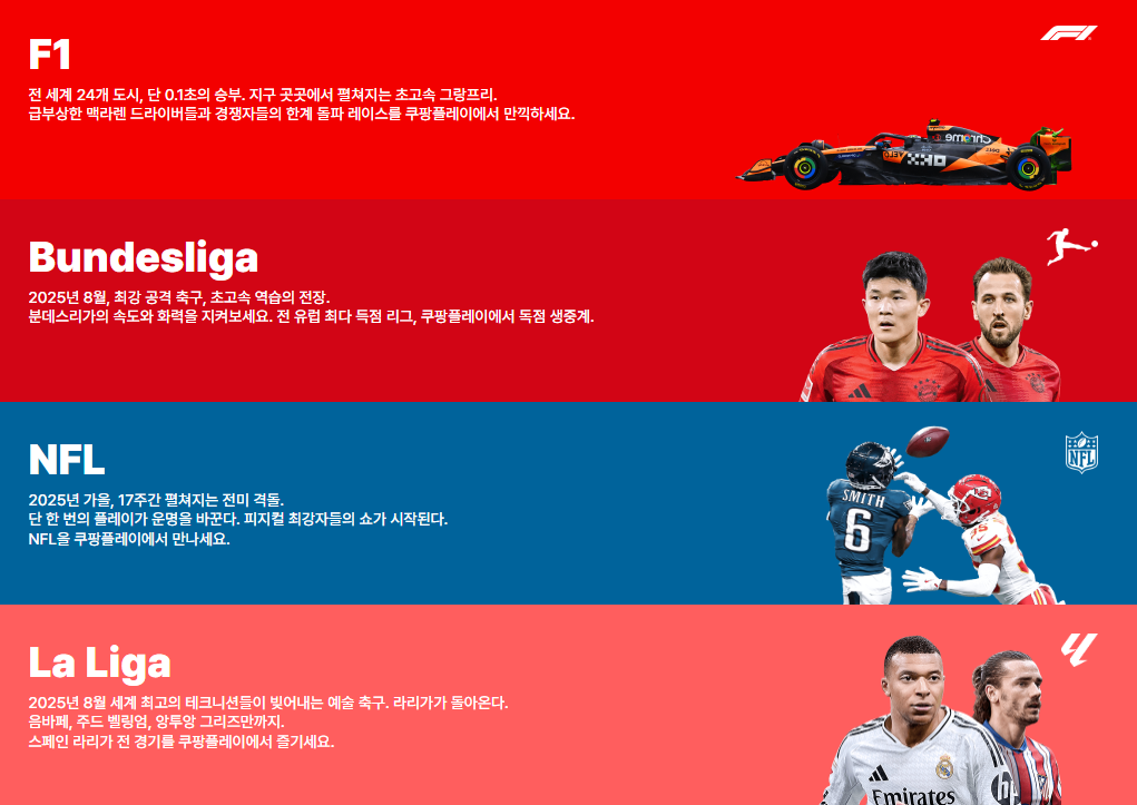 - 콘텐츠 범위: EPL, 라리가, 분데스리가, NBA, NFL, F1, LIV 골프, PGA 챔피언십 등 총 48개 리그·대회, 하반기엔 PL 써머 시리즈, NBA도 포함
